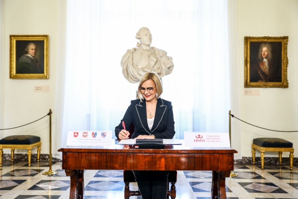 Koronacja Bolesława Chrobrego w 1025 roku była przełomowym momentem w dziejach Polski. To znamienne wydarzenie sprawiło, że dołączyliśmy do europejskiej rodziny cywilizowanych narodów. Tym samym rozpoczęła się historia suwerenności Polski, która trwa do dzisiaj. 1000-lecie koronacji Bolesława Chrobrego to ważny powód do świętowania. Sandomierz, Wiślica i Kraków – to ośrodki, które w tamtym okresie miały zasadnicze znaczenie. Dwa z nich leżą obecnie na terenie województwa świętokrzyskiego, dlatego z wielką radością podpisuję się dzisiaj pod porozumieniem czterech województw, które będzie hołdem oddanym naszej historii i wyrazem odpowiedzialności za przyszłość – zaznacza Renata Janik, Marszałek Województwa Świętokrzyskiego.