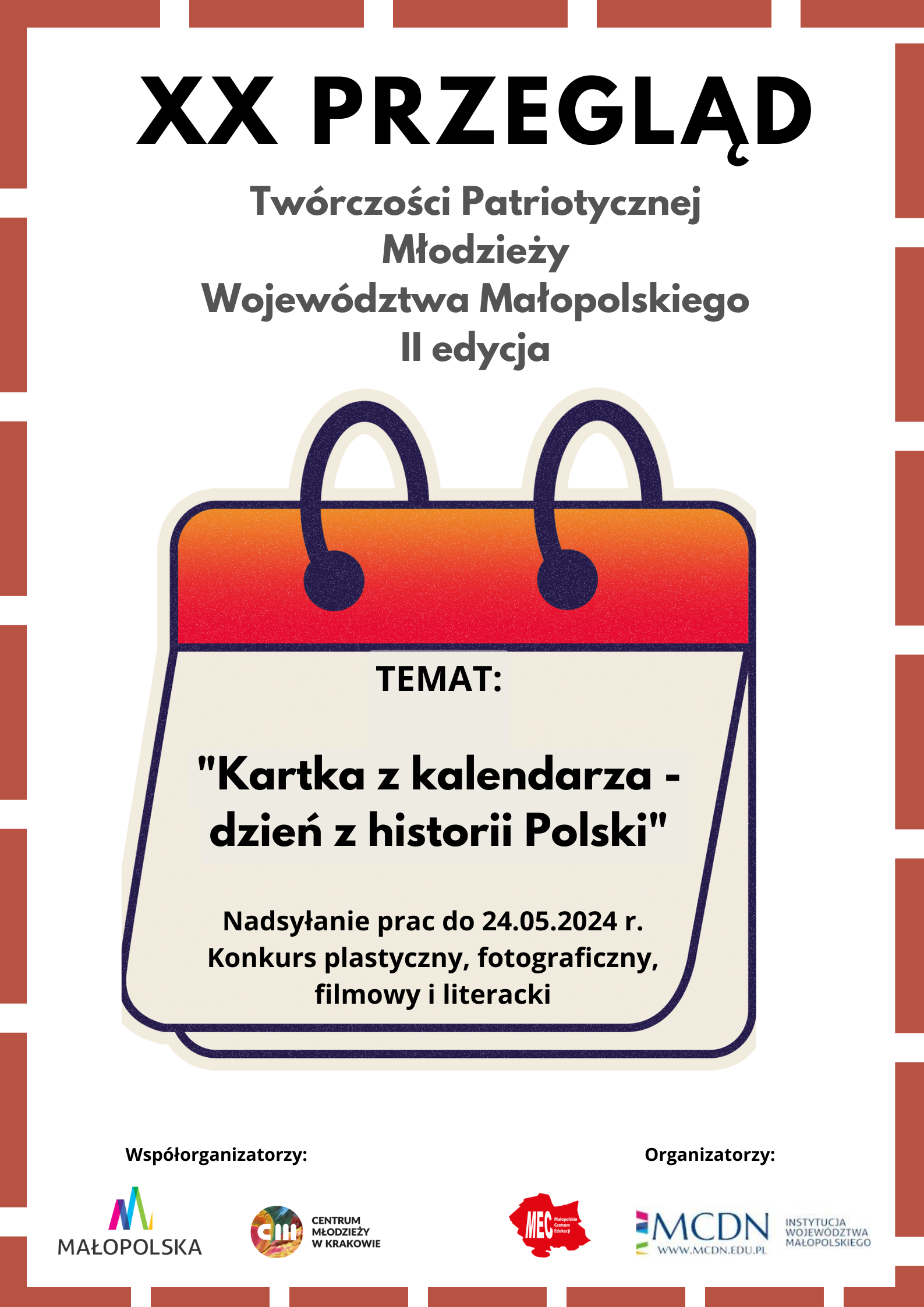 Tematem przewodnim tegorocznej edycji „Przeglądu” jest: „Dzień z historii Polski – Karta z kalendarza”. XX edycja „Przeglądu” składa się z konkursu literackiego, plastycznego i fotograficznego oraz filmowego, w których za pomocą nowoczesnych technik młodzież będzie mogła wypowiedzieć się na temat pojęcia patriotyzmu. Organizatorzy pragną w ten sposób promować talent uczestników oraz ich wiedzę historyczną. Na prace uczestników czekamy do 24 maja 2024 roku. Na zwycięzców czekają atrakcyjne nagrody (laureaci dokonują wyboru nagrody indywidualnie w ramach określonej kwoty).Organizatorzy zakładają umieszczenie wybranych prac w „Śpiewniku polskich pieśni patriotycznych”, który zostanie przekazany do małopolskich placówek oświatowych biorących udział w projekcie „Młodzież pamięta” w 2024 roku. Zostaną one również zamieszczone w kolejnym wydaniu kalendarza historycznego oraz na stronie internetowej organizatora – Małopolskiego Centrum Edukacji „MEC”.