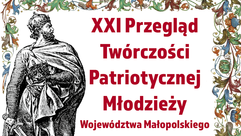 Zapraszamy do udziału w XXI edycji „Przeglądu Twórczości Patriotycznej Młodzieży Województwa Małopolskiego”. Przegląd składa się z konkursu literackiego, artystycznego oraz audiowizualnego, w których za pomocą nowoczesnych technik młodzież będzie mogła wypowiedzieć się na temat pojęcia patriotyzmu.