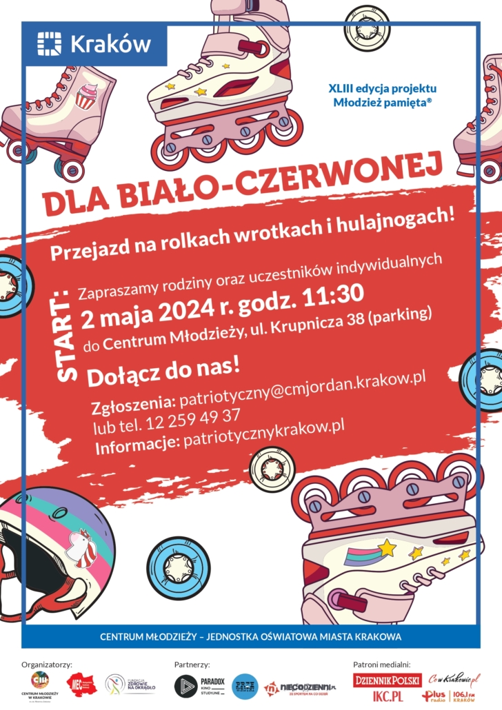 2 maja przypada Święto Flagi Rzeczpospolitej Polskiej. Z tej okazji, od wielu już lat Centrum Młodzieży im. dr. H. Jordana oraz Małopolskie Centrum Edukacji “MEC” organizują przejazd na rolkach, wrotkach i hulajnogach pod nazwą ” DLA BIAŁO-CZERWONEJ”. Także i w tym roku, w imieniu organizatorów zapraszamy do wzięcia w nim udziału. Serdecznie zapraszamy zarówno uczestników indywidualnych jak i rodziny.