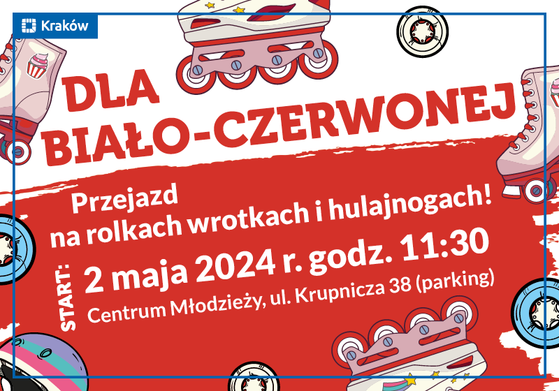 2 maja przypada Święto Flagi Rzeczpospolitej Polskiej. Z tej okazji, od wielu już lat Centrum Młodzieży im. dr. H. Jordana oraz Małopolskie Centrum Edukacji “MEC” organizują przejazd na rolkach, wrotkach i hulajnogach pod nazwą ” DLA BIAŁO-CZERWONEJ”. Także i w tym roku, w imieniu organizatorów zapraszamy do wzięcia w nim udziału. Serdecznie zapraszamy zarówno uczestników indywidualnych jak i rodziny.