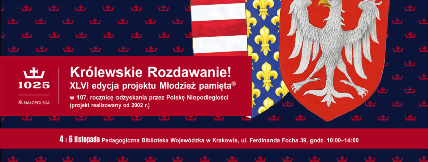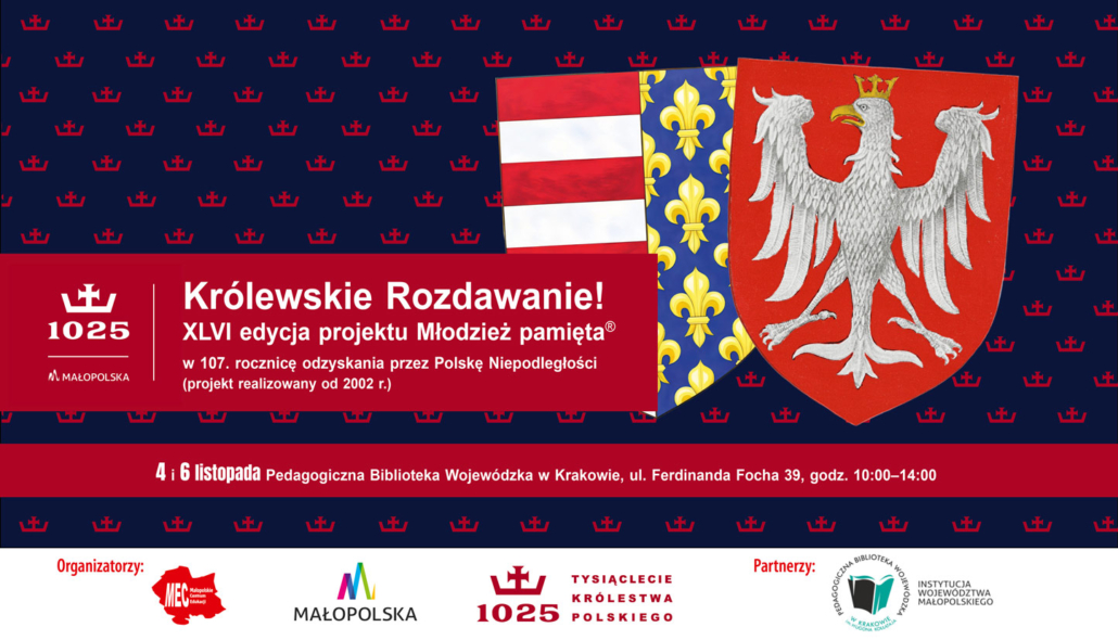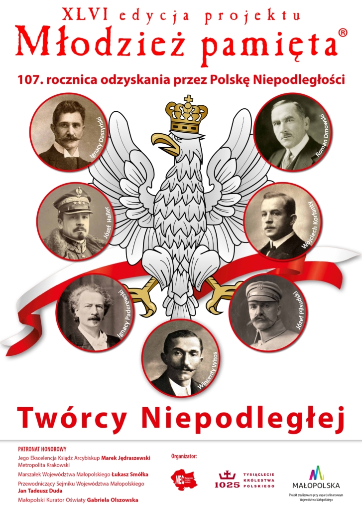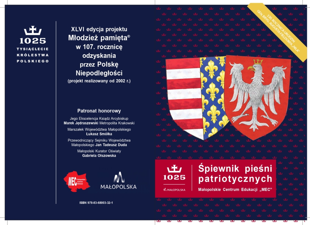 W związku ze zbliżającą się 107. rocznicą odzyskania przez Polskę Niepodległości przesyłamy tradycyjnie list od Marszałka Województwa Małopolskiego, Pana Łukasza Smółki dotyczący kolejnej edycji projektu Młodzież pamięta®. Zapraszamy do odbioru materiałów okolicznościowych, w tym śpiewników pieśni patriotycznych zawierających wkładkę tematyczną pt. „Generał August Emil Fieldorf „NIL”-bohaterski Małopolanin” w 130. rocznicę urodzin.